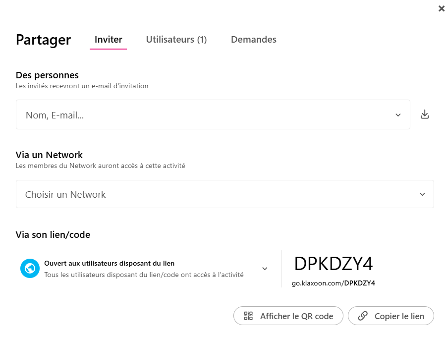With an access code : Give the access code to your participants so that they can join the Klaxoon activity.