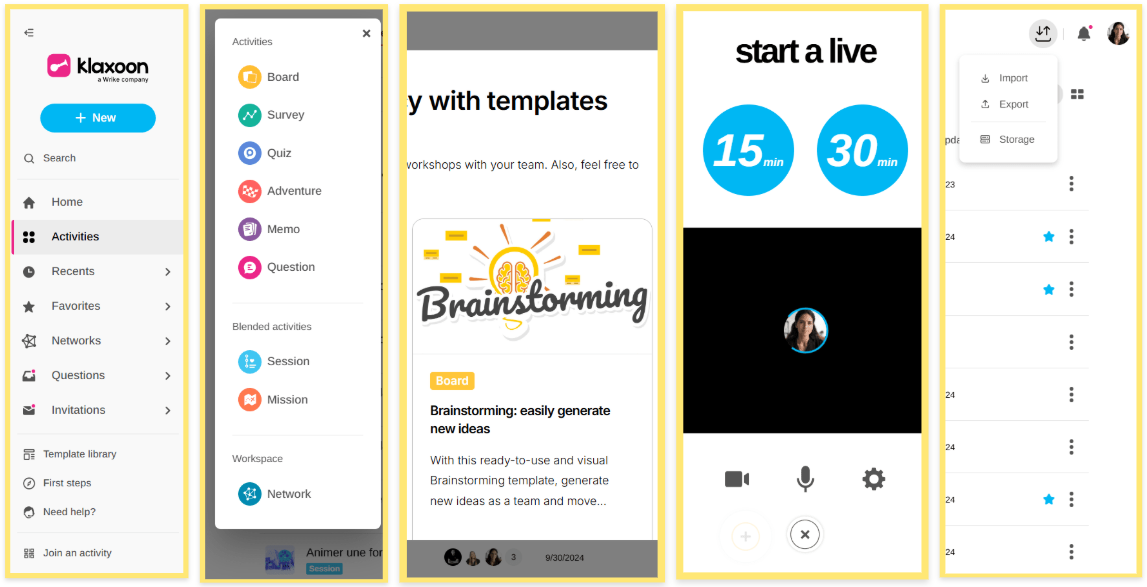 The Session is a synchronous, structured and rhythmic activity by a facilitator. It allows you to guide a group of participants through a series of planned Klaxoon activities (Poll, Quiz, Board, etc.) over a defined period of time.