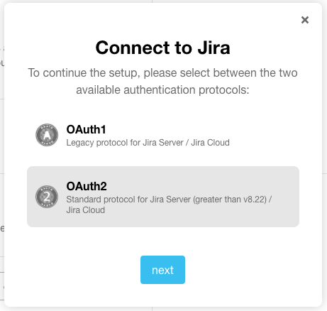 If Klaxoon does not recognize the Jira URL or the version of Jira is unknown, you will be asked to select between two authentication protocols.