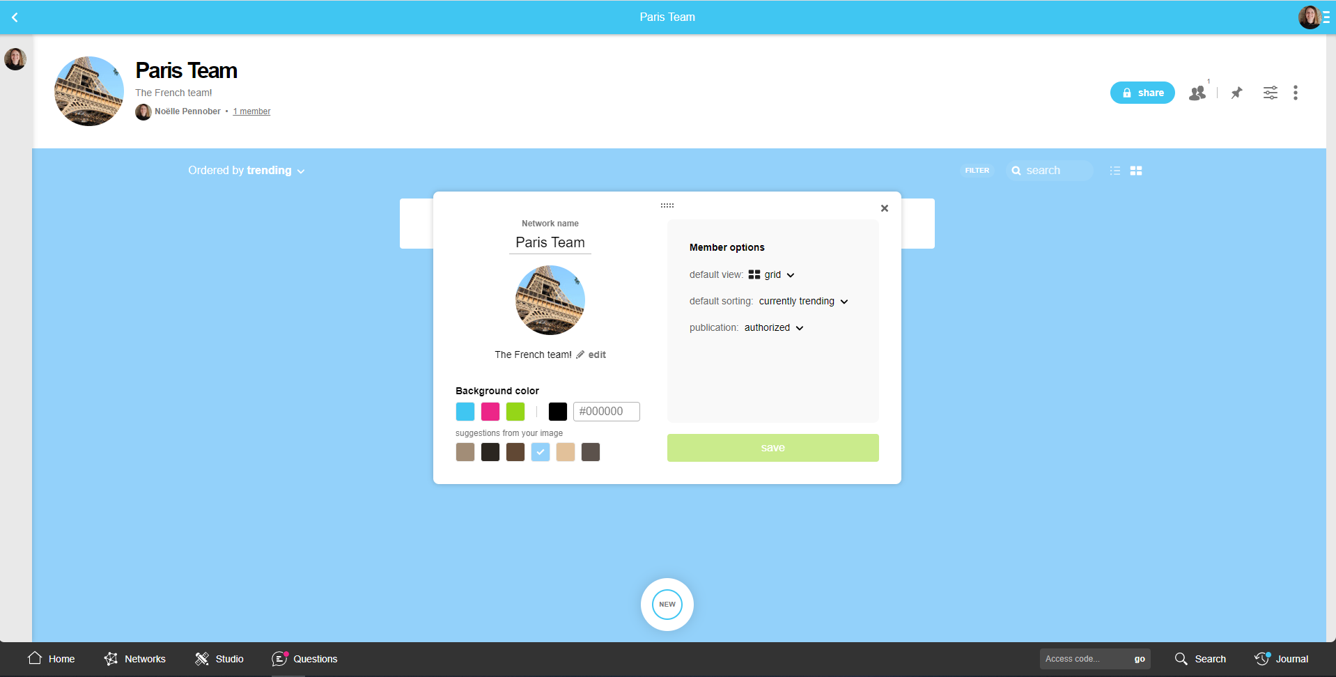 On the left side of the settings module you can change the title, the image, the description, and the color of the Network.
