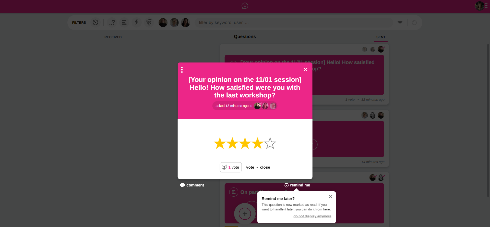 This enhancement will considerably optimize the organization of your Inbox: the /userspace/questions page. Previously, when you had viewed or replied to a Question, it would automatically disappear from the page. Now, with the new "Remind me" function, you can schedule a reminder, ensuring that your Question returns to your Inbox. With this improved and user-friendly function, you'll experience a higher response rate to your Questions!