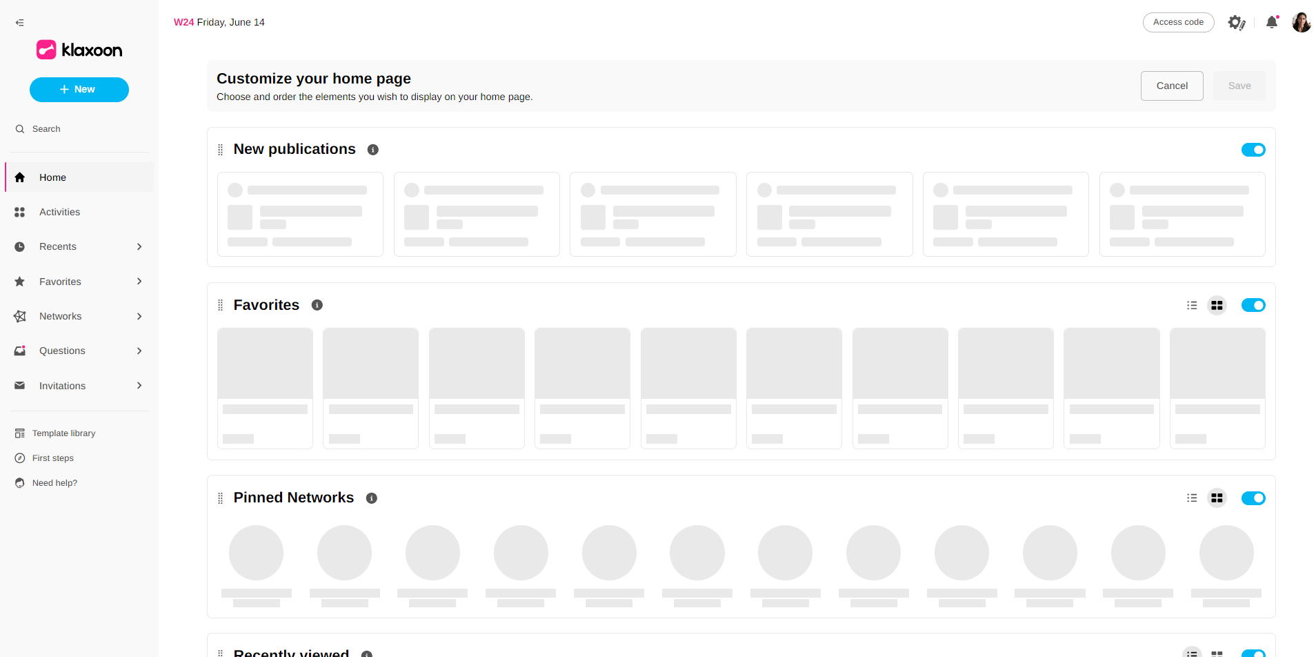 This feature has been available to all Klaxoon users since June 20th 2024. If you'd like to find out more about the other features of the home page, see this article "The new home page". Don't hesitate to consult our Support team via chat so that they can answer your questions.