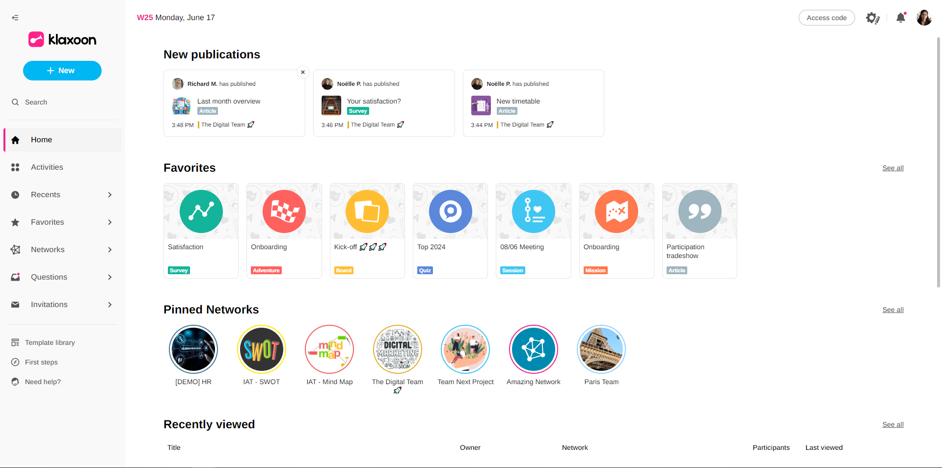 Make sure you don't miss any new publications from the Networks you're a part of! The "New publications" block has been added to your home page to keep you informed of Klaxoon activities that have just been published.