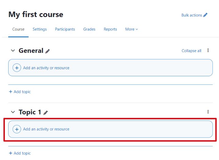 Log in to your Moodle teacher account, and choose "My courses". Select the course in which you wish to include a Klaxoon activity and switch to edit mode. You can then "Add an activity or resource".