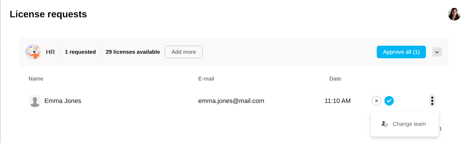 💡 Please note : As a company admin, you have the ability to move requests from one team to another to take advantage of available licenses where they are
