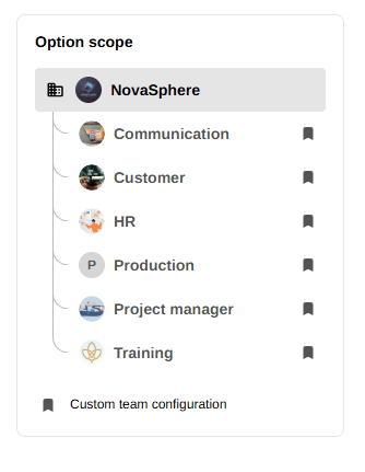 When an option is configured differently at the team level and at the company level, then a bookmark icon appears