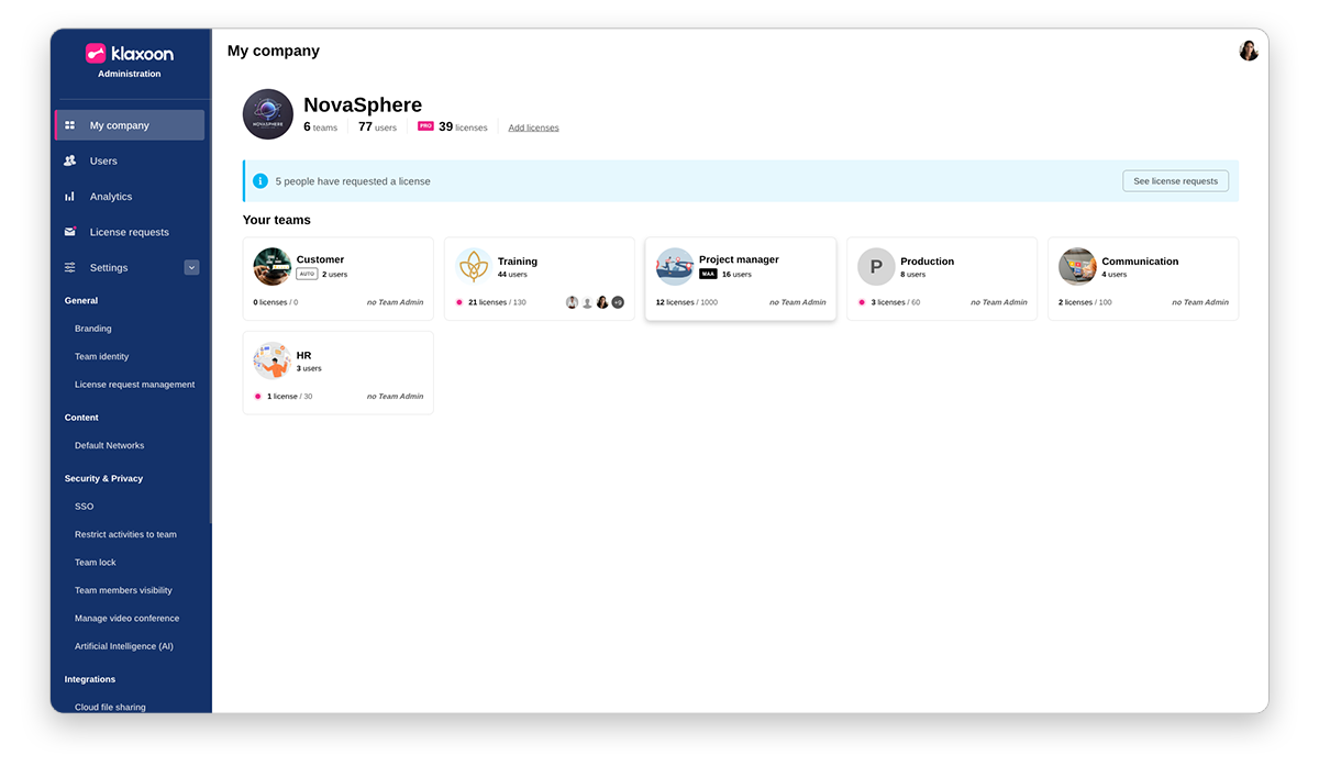 The "Manage my company/team" tab now becomes "Administration". Accessible from your profile menu, it opens the admin space in its own tab. Simply close the tab when you are finished to return to the Klaxoon platform