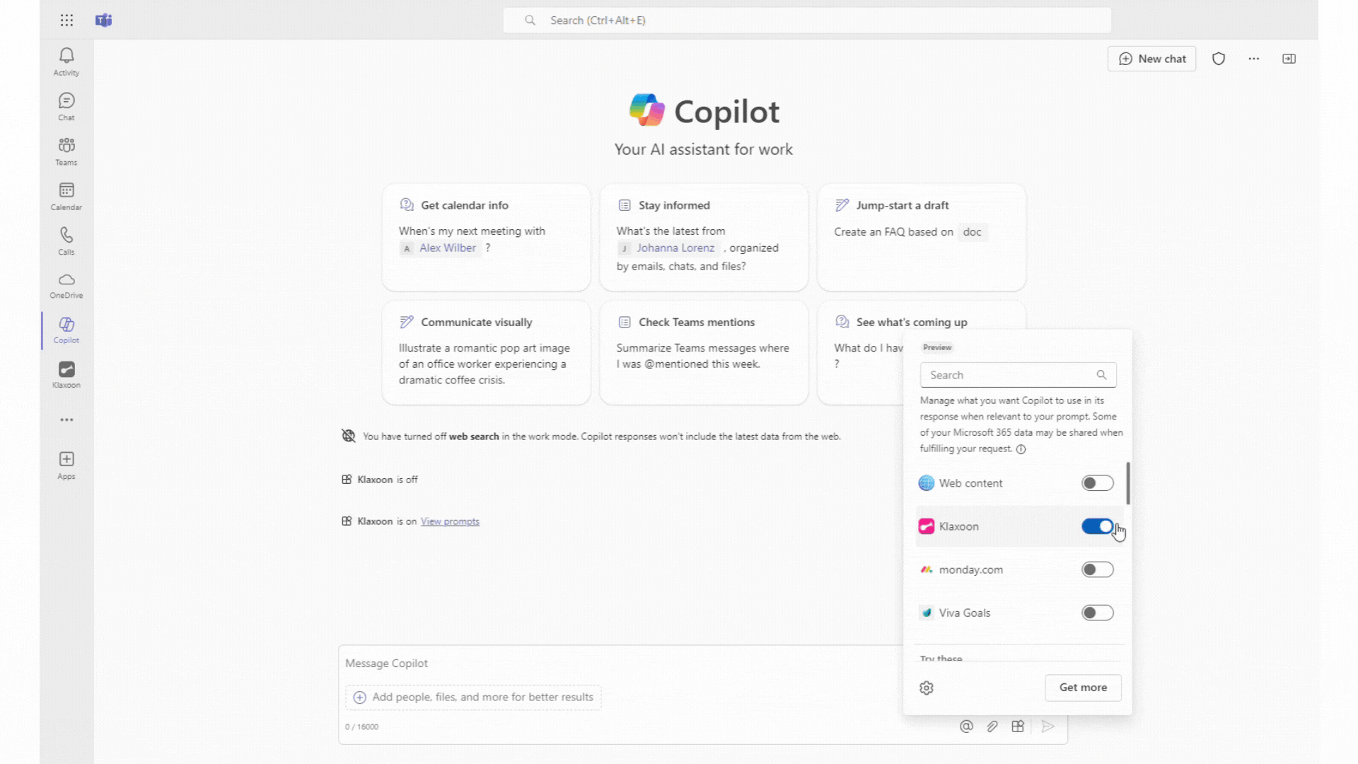 Adding Klaxoon to Copilot is very simple! In Teams, go to the Copilot space. Then click on the button to enable agents at the bottom right of the text field, then on "More plug-ins". Then search for Klaxoon and add it to your list. All you have to do is click on the button to activate it and log in.