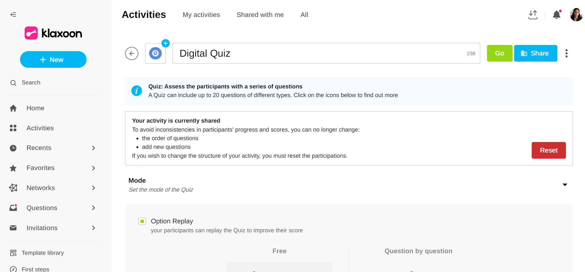 Until now, when you prepare an Activity such as a Quiz, a Survey or even a Mission, once shared, you could no longer modify the structure. You could no longer change the order of the questions, modify certain parameters or share the activity in pseudonym mode.