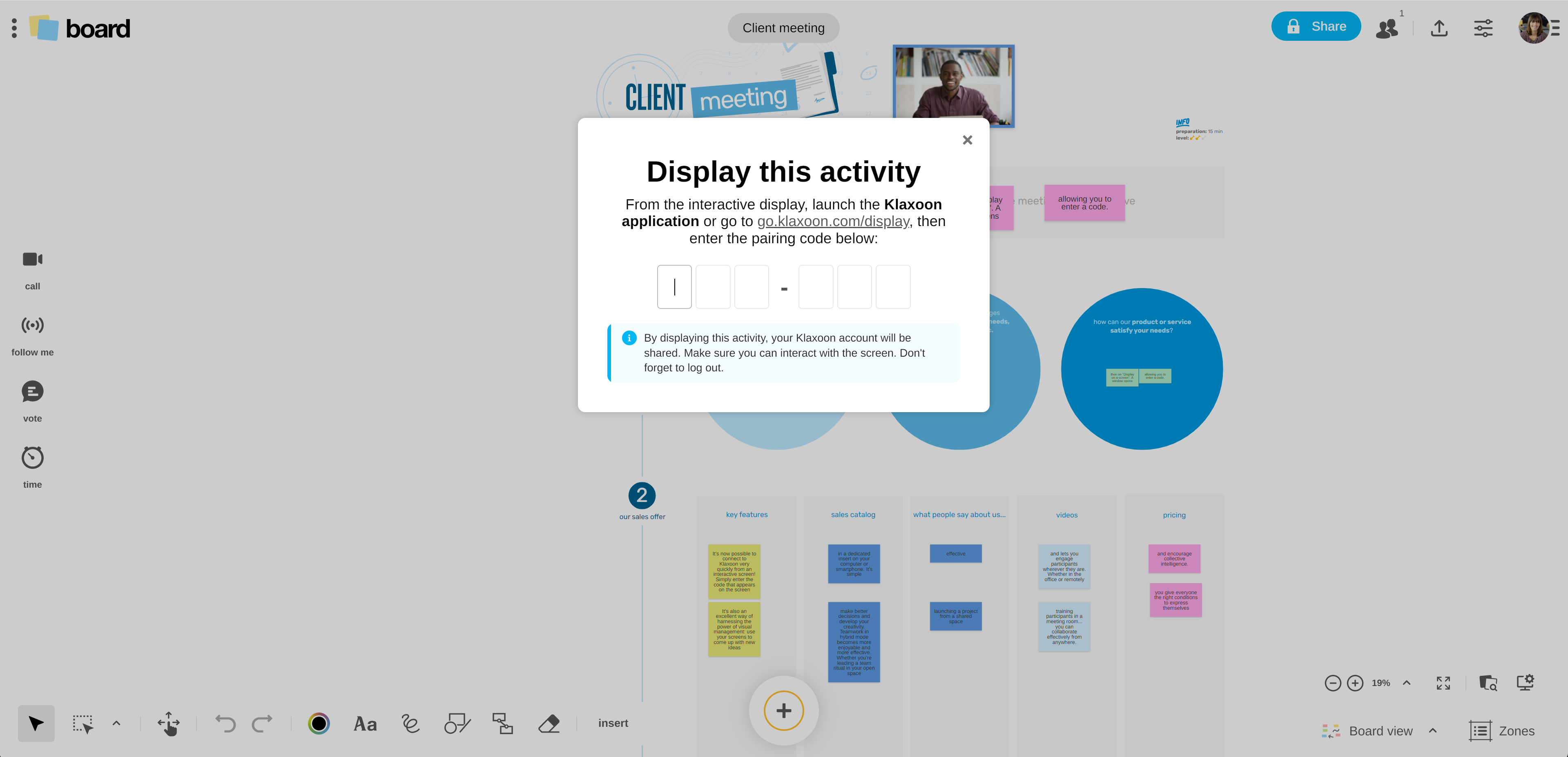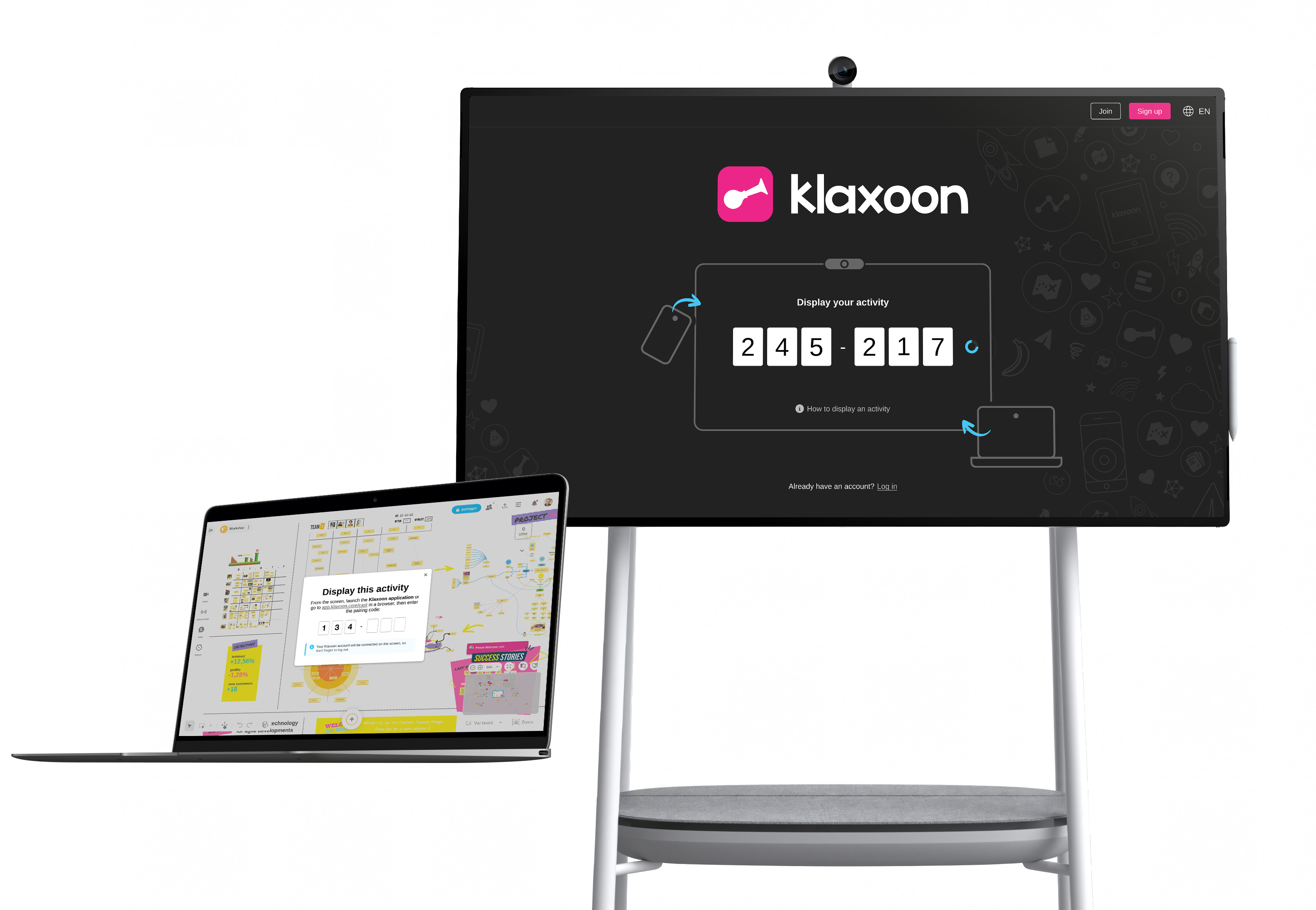From the big screen, launch the dedicated Klaxoon application if installed, or go to go.klaxoon.com/display. A code appears on the screen, all you have to do is enter the code in your computer or smartphone. The code is updated every 45 seconds.