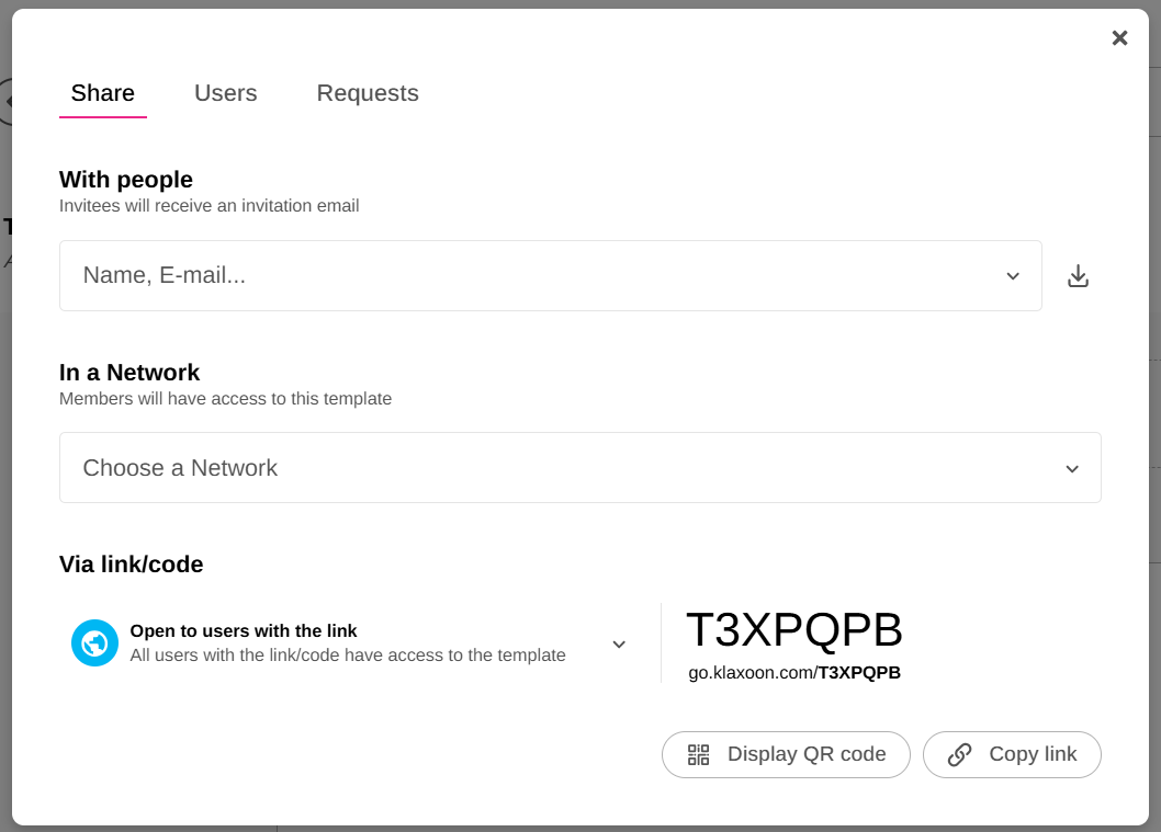 The "Publish" button is evolving to become "Share", and align with the general mode of distribution of Klaxoon activities. From now on, publishing in a Network is no longer the only way to share templates. Share your Templates like any other Klaxoon activity, whether it's via a Network, a code/link or a direct invitation.