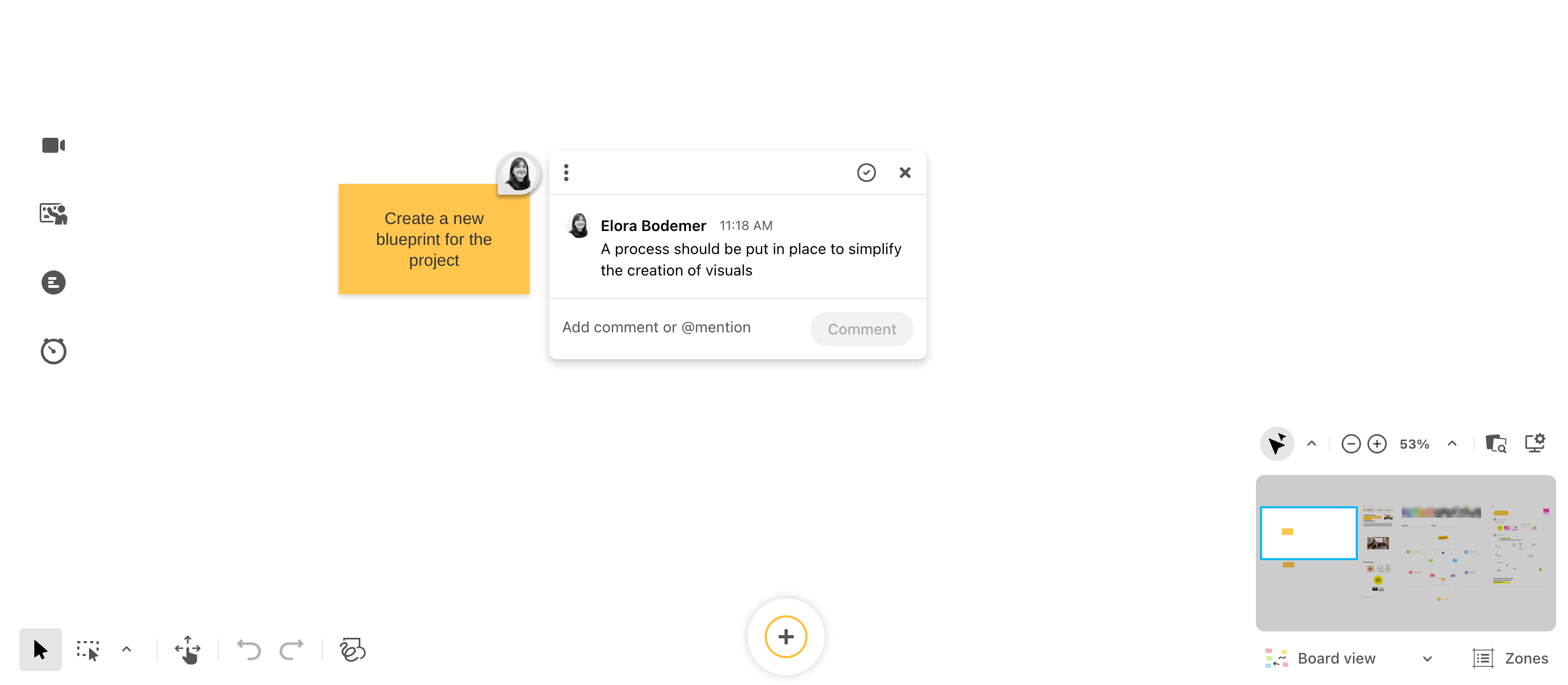 All comments on a Board are now centralized in a side panel. This allows you to quickly browse through all active threads, so you can keep track of the discussion at a glance, without having to scroll through the Board object by object.