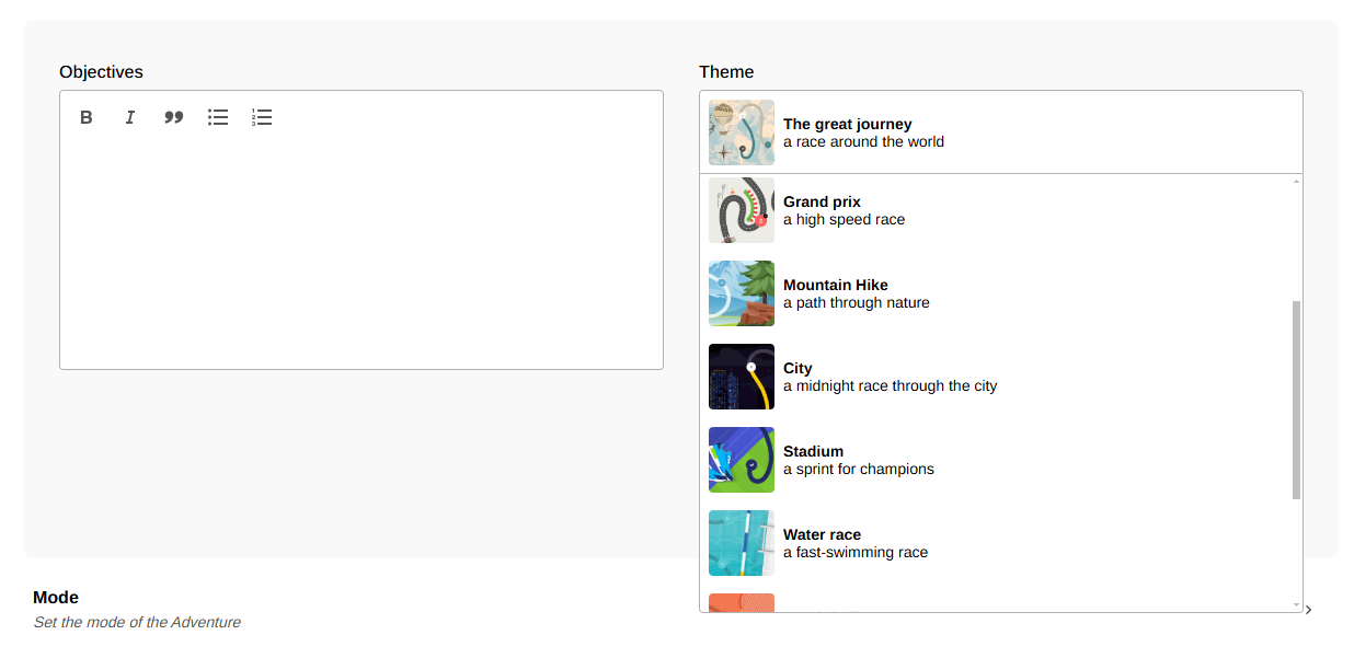 Until now, you could choose from four themes for your Adventures and Missions. Today, seven new visual universes are added to generate more engagement from your employees in your gamified journeys.