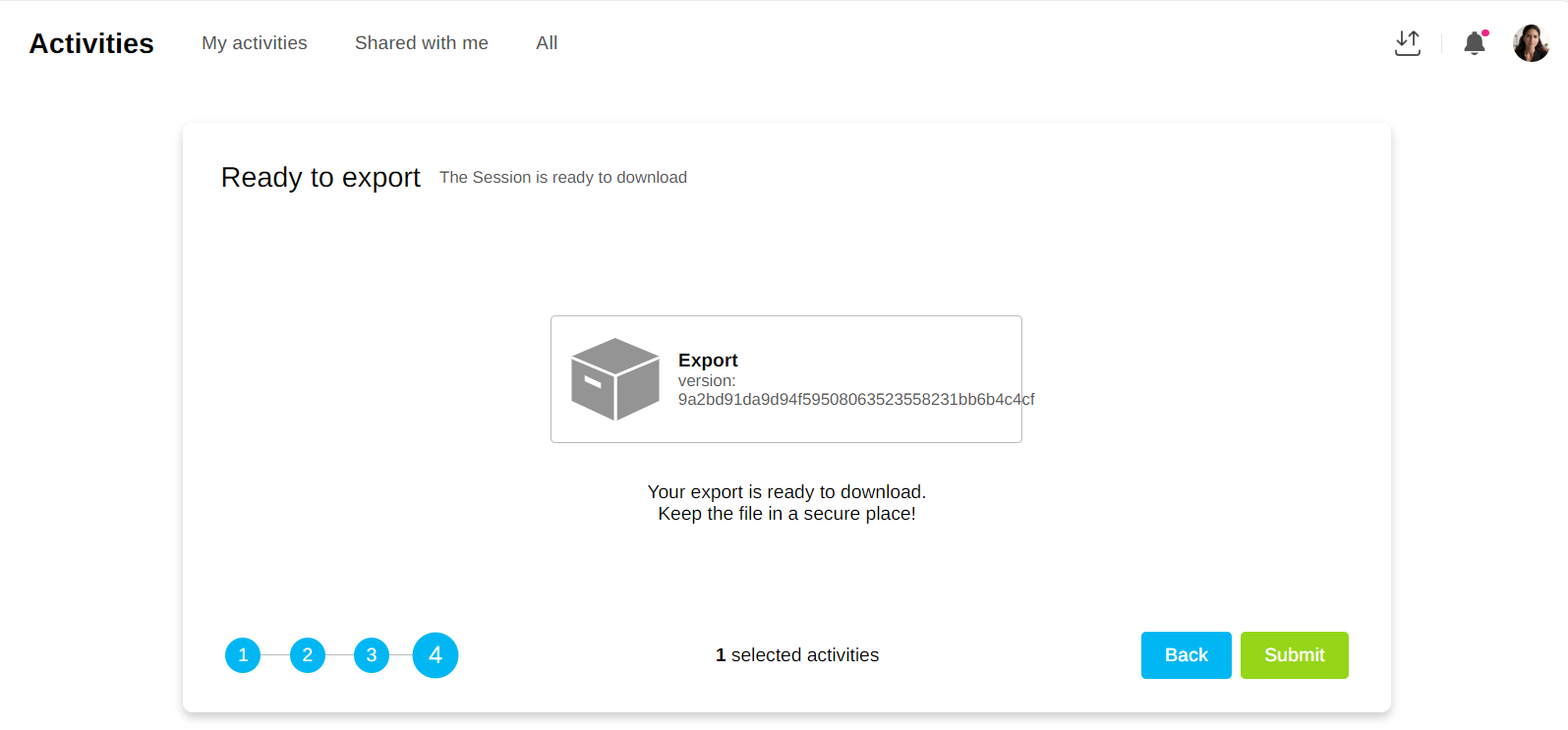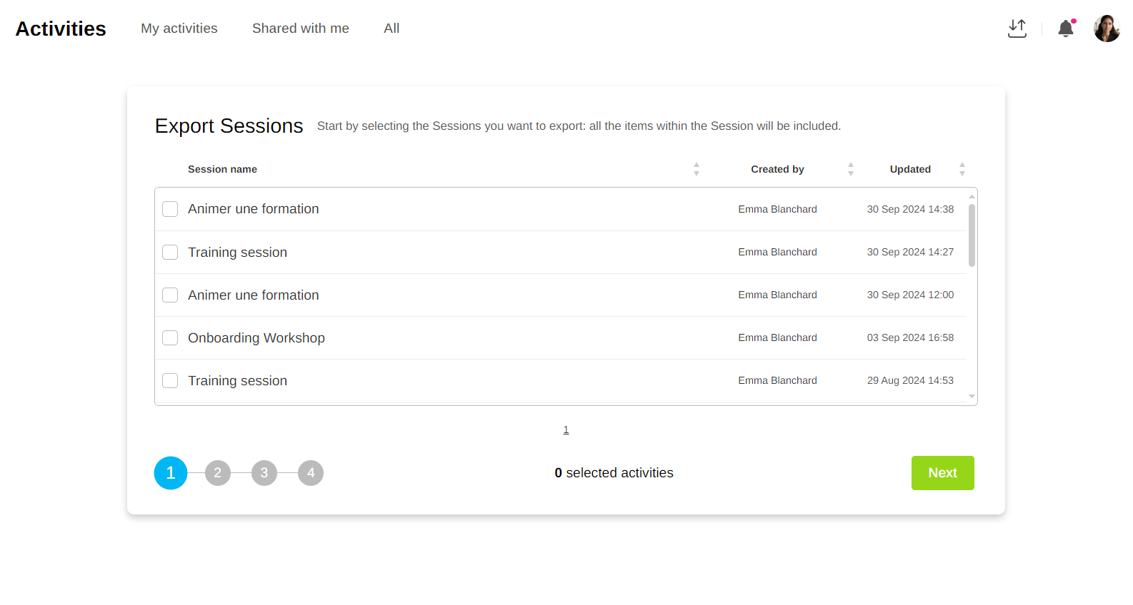 In the ‘Activities’ tab, you can export your activities in the form of KLX files which can then be reimported into another Klaxoon account.