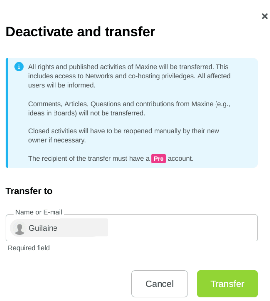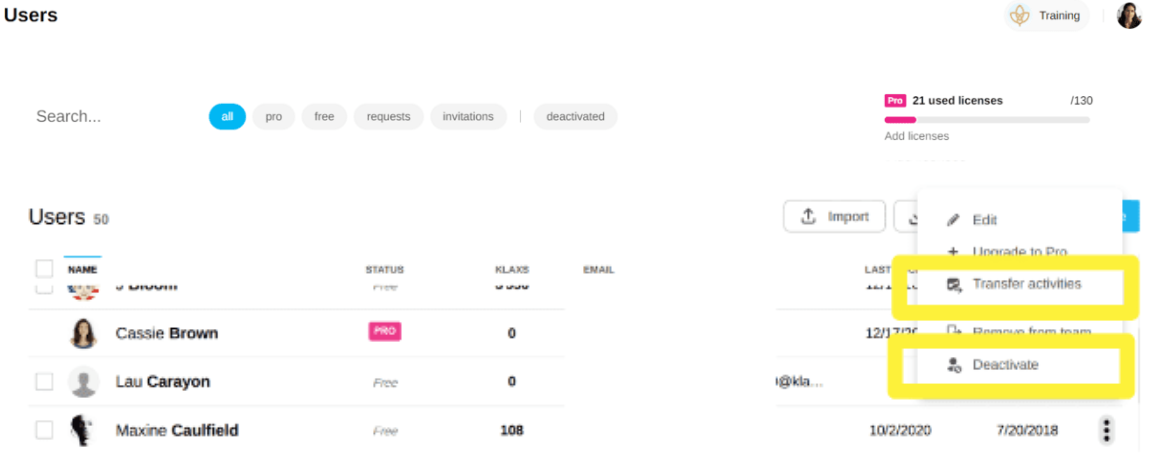 2 - From the "Users" tab, click on "Transfer Activities" or "Deactivate"