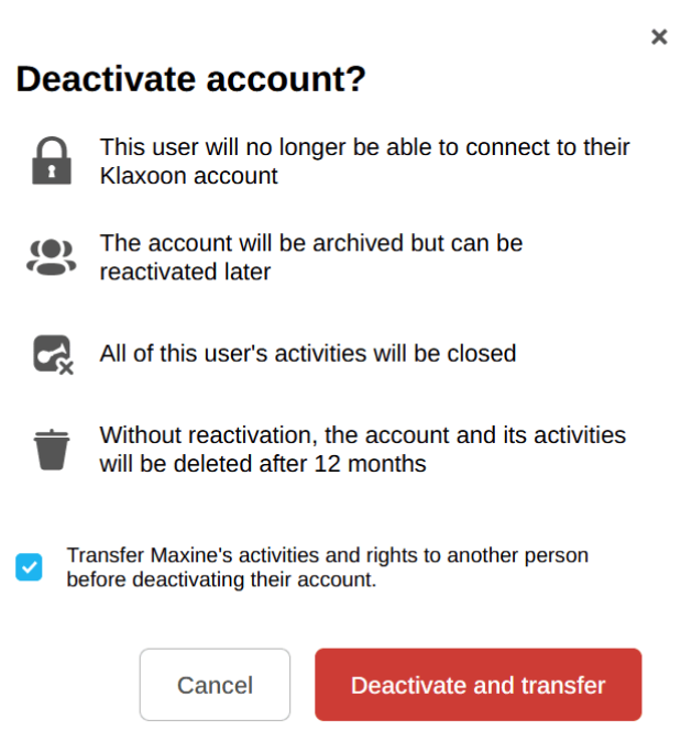 The action of a total transfer of all Klaxoon Activities from one user to another is only available to the Administrator from the administration interface.He/she will have to :