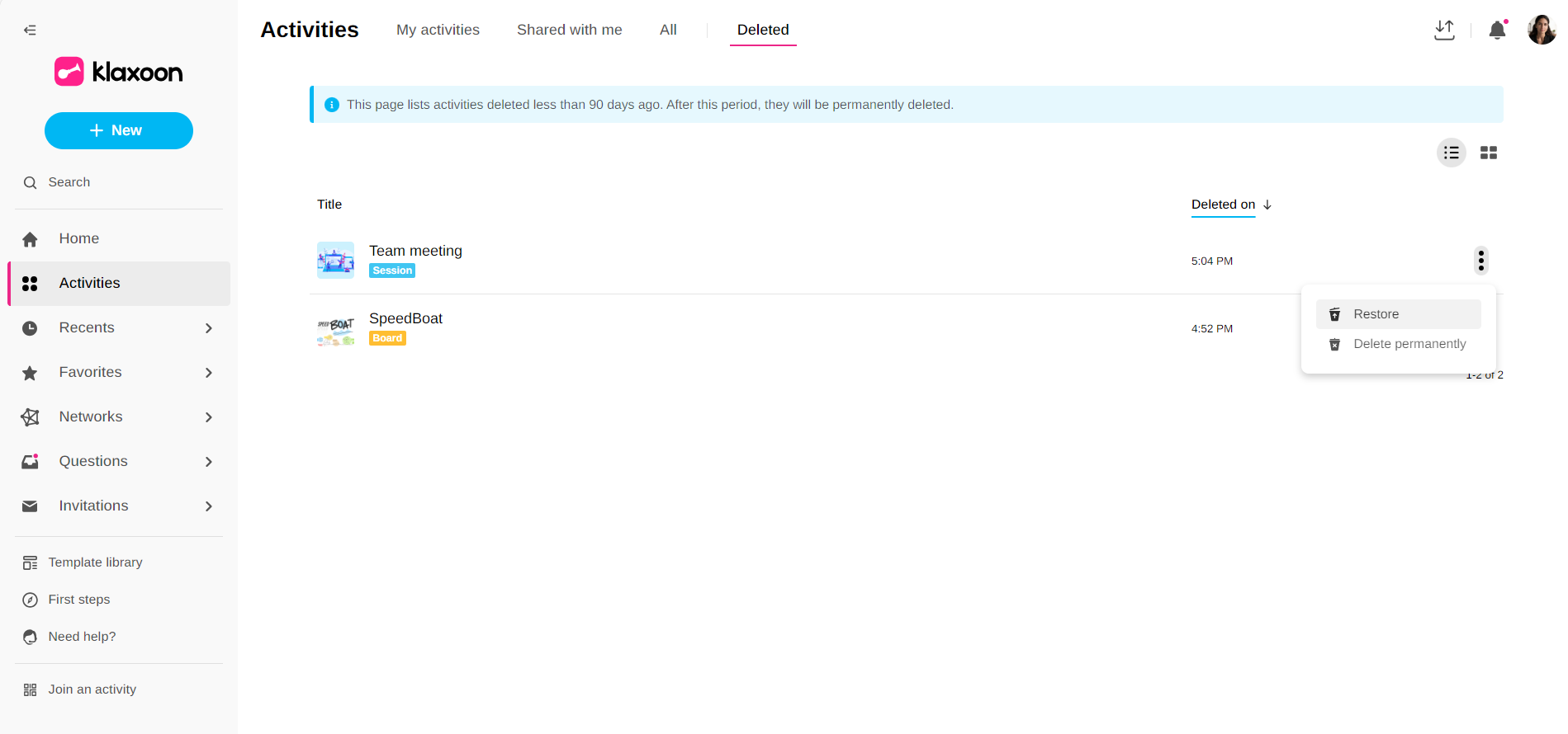 Here you'll find a list of activities deleted less than 90 days ago, with the option of restoring them (PRO users only) or deleting them permanently.