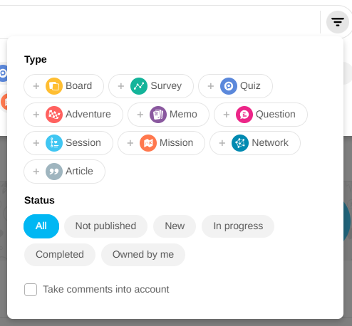Enter keywords: In the search bar at the top of the screen, start typing the title of the Board or activity, or relevant keywords (e.g., a participant's name or a topic).