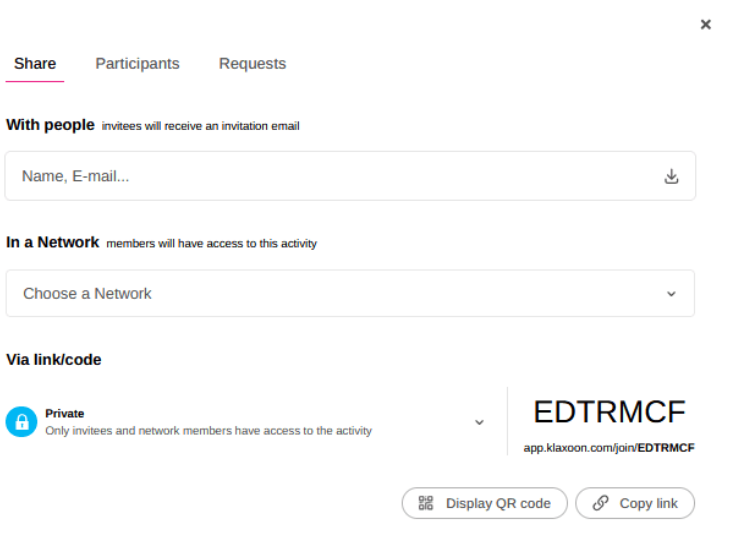 Broadcast the activity on a Network: select a target Network, all members of this interactive space will have the right to access your activity.