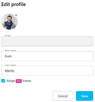 Edit the first and last name or assign or withdraw a license.