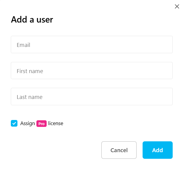 Complete Email address, first name and last name, then assigne a PRO licence or not.