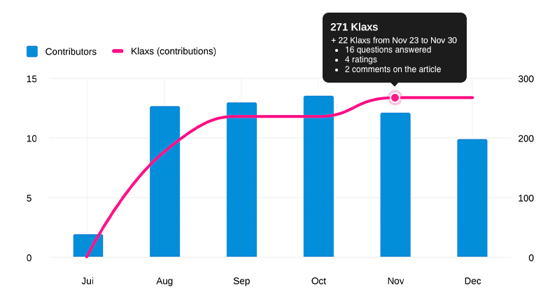 Via the evolution of the number of Klaxs over time. By hovering your cursor over the pink line, you can see details of the actions that generated Klaxs (creating ideas, answering questions, etc.).