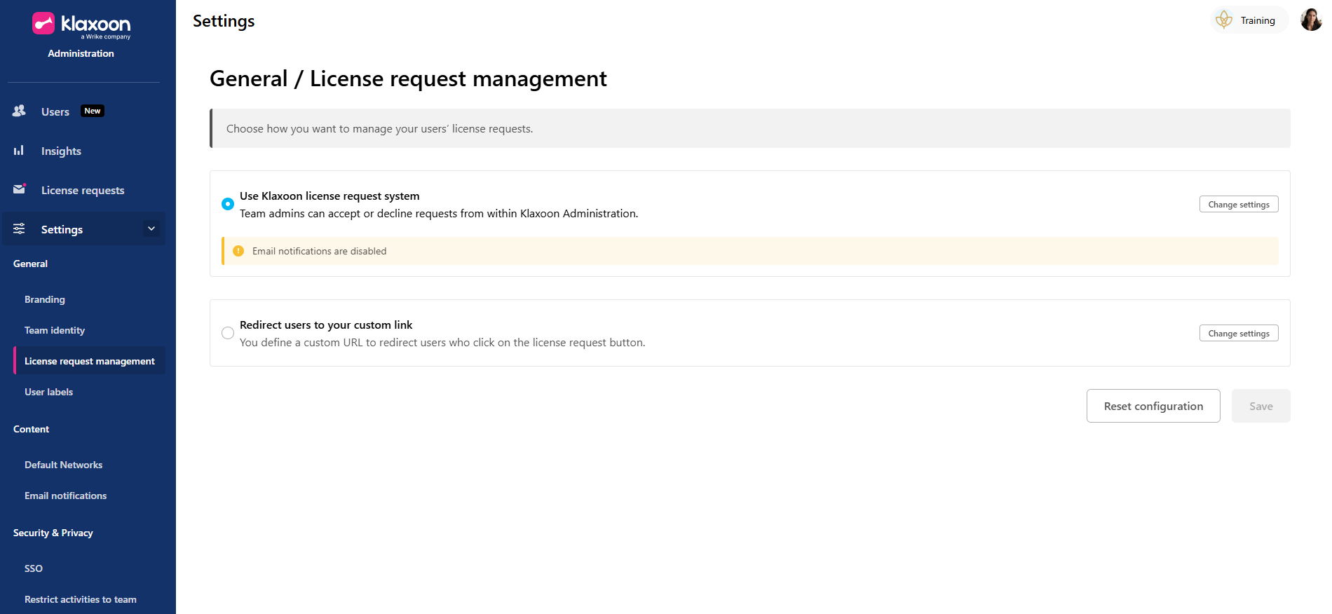 In the left-hand column, click on “Settings”, then on “License request management” and finally on “Modify settings”.