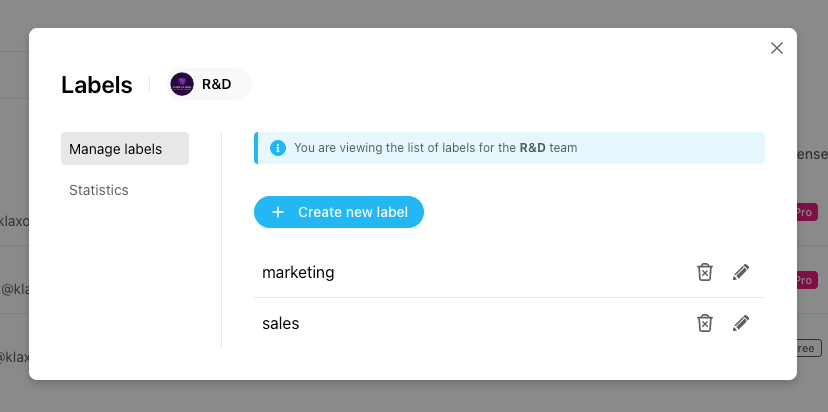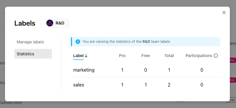 To access the Labels statistics, choose a user, click on their 3 dots menu, hover “Add label” then click on “Manage labels”, then on the “Statistics” tab on the left.