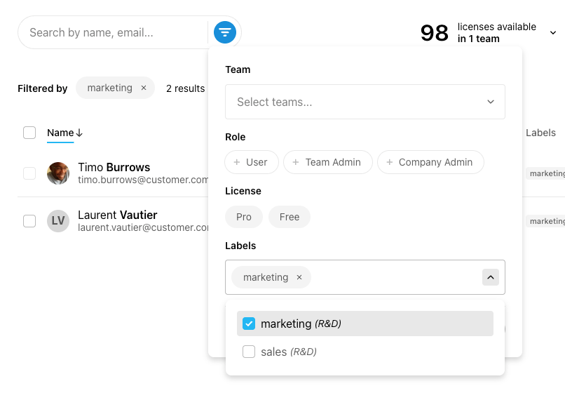 User Labels allows Admins to create custom labels and assign them to users in their team. These labels are visible only to admins and are not accessible by regular users. Labels help you organize, filter, and group users for purposes like internal reporting, cost splitting, or team management.