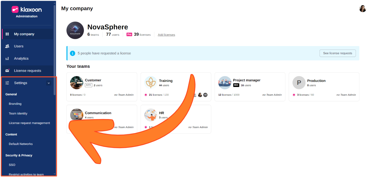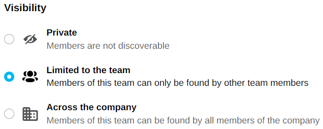 Team members visibility: choose who can find members of this team using the contact search (Question, Invitations....). Team members remain reachable by thos they've interacted with on Klaxoon (shared Network...)