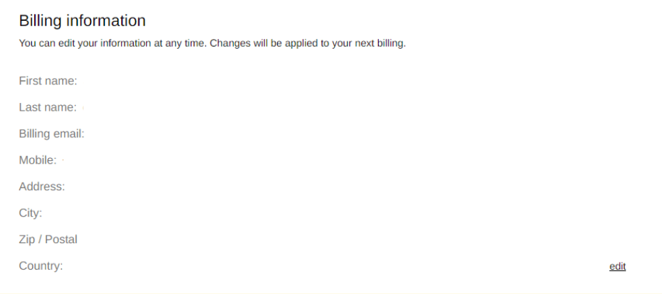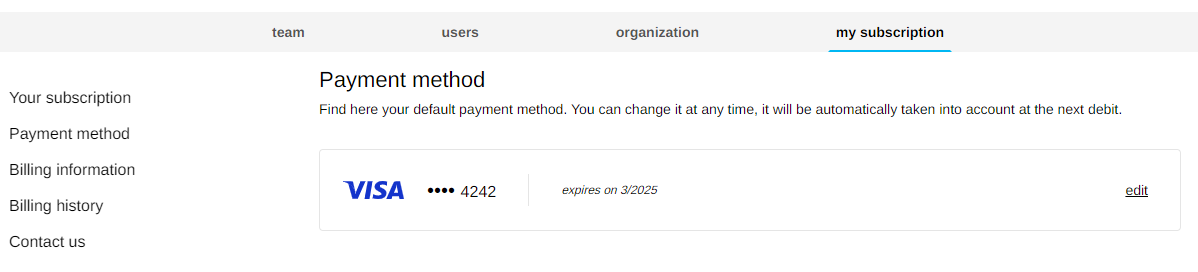 To edit the credit card associated with your subscription, click on Edit at the end of the row. (payment by credit card only)