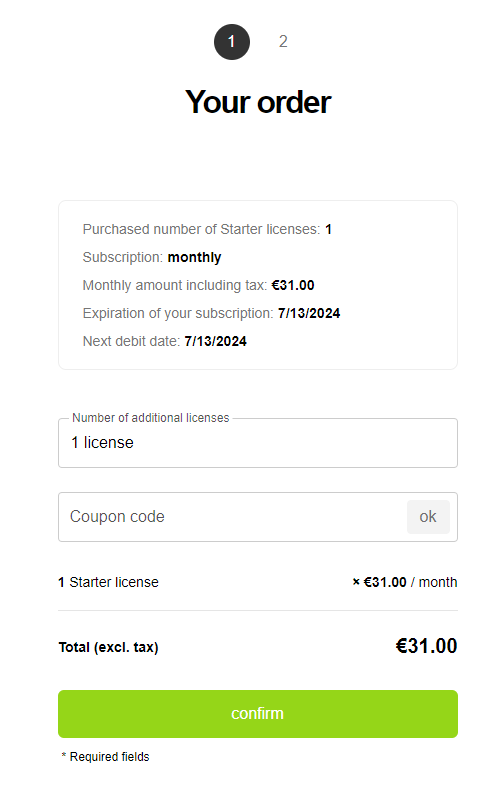 To add a license to your subscription, click on Buy more licenses and choose the number of licenses you want to add.