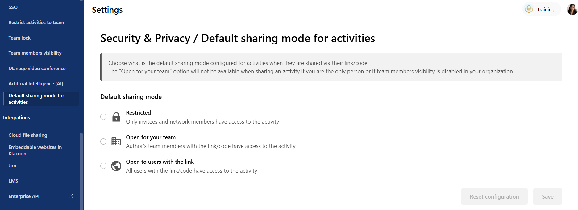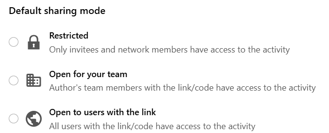 As an Admin of a team or company, you have the option to set the default way to share activities created by members of your Console. This feature aims to increase access control and privacy of content shared within your organization.