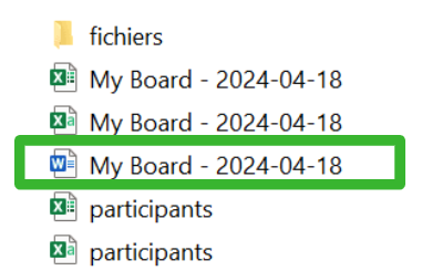 From your Board, as a presenter, click on the export button and then on "Zip" or "Word Rapport" to extract the data from the Board.