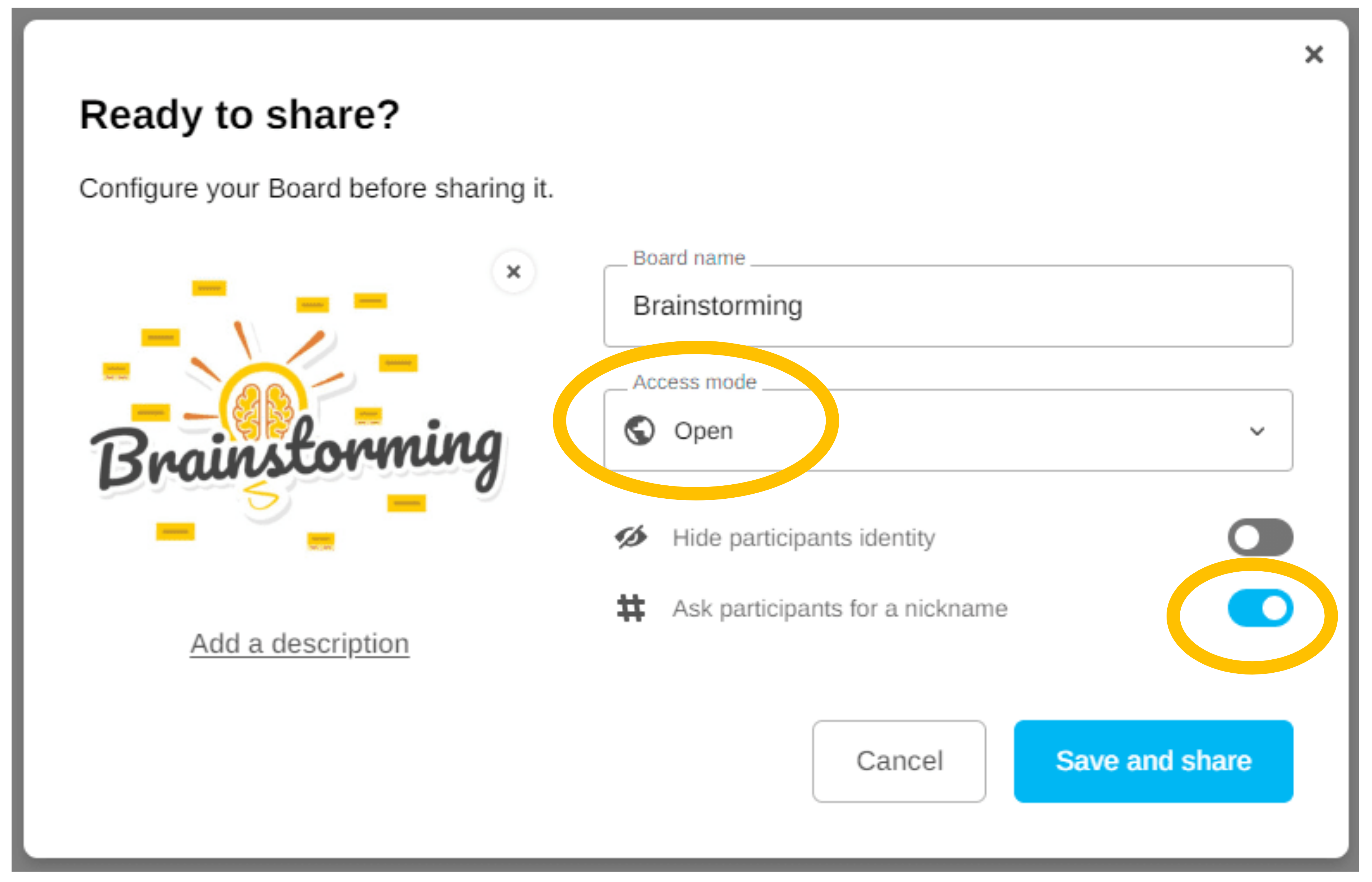 Share your Board by checking the "Ask participants for a nickname" option and choosing the access mode "Open to users with the link".