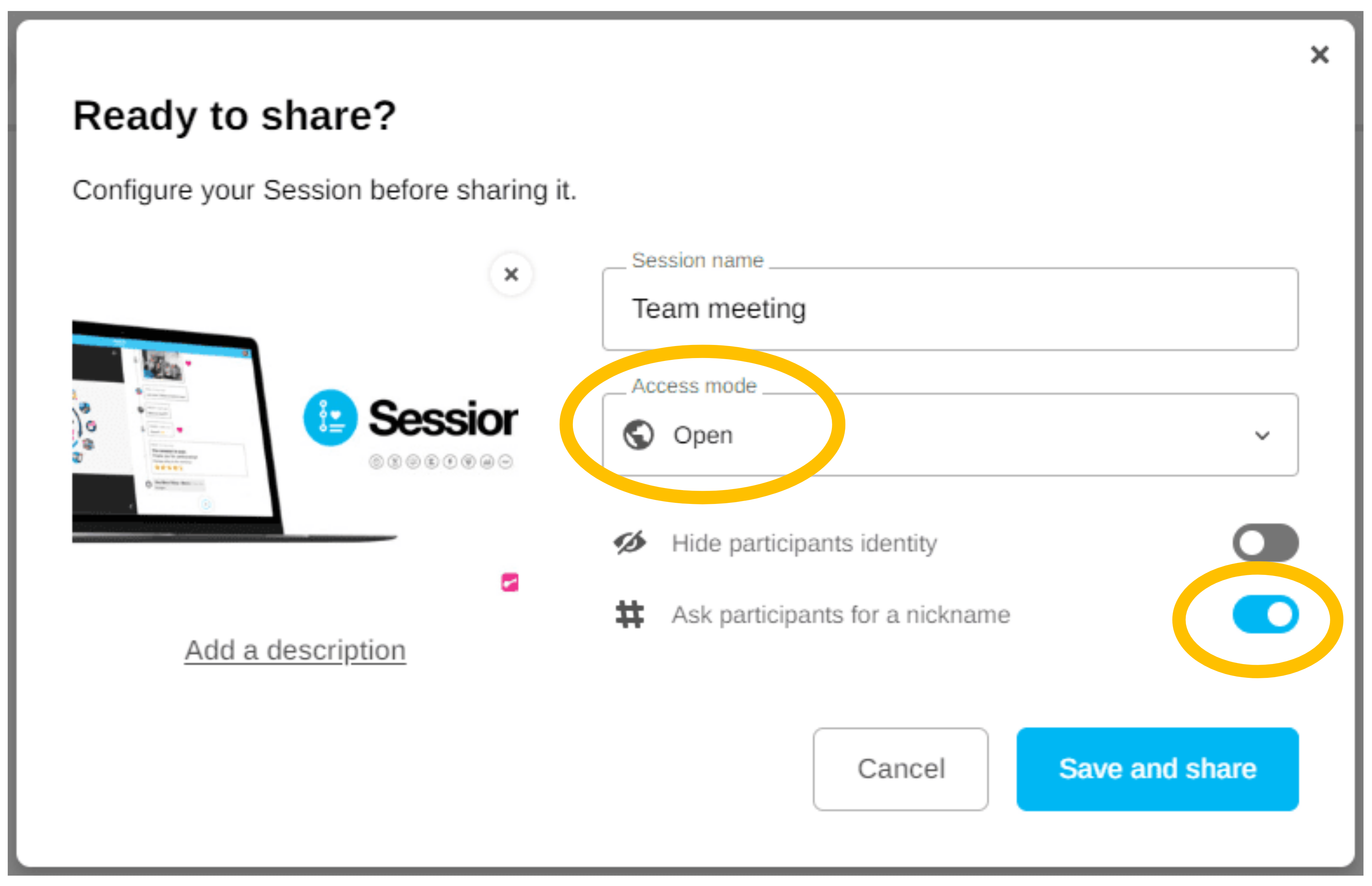 Share your Session by checking the "Ask participants for a nickname" option and selecting the access mode "Open to users with the link".