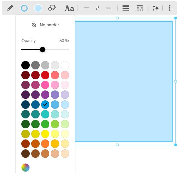 Do you want to bring an extra touch of subtlety and creativity to your boards? Good news! It is possible to modulate the transparency of your shapes, connectors, drawings, sketches and SVG icons directly from the color menu.