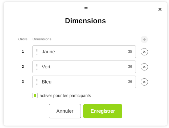 Dimensions are used to further qualify ideas. Dimensions take the form of free fields at the bottom of each idea. Participants are free to enter additional details (e.g. first name, date, keyword). The moderator can then use these criteria to refine the sorting of ideas.