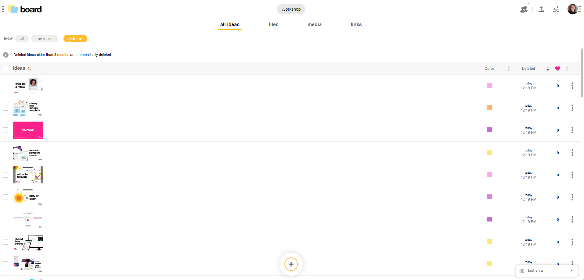 To restore or permanently delete your deleted ideas, access the list view from the "Board view" tab in the bottom right-hand corner of your screen.