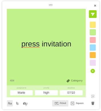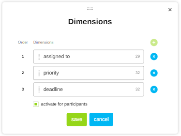 In addition to categories, dimensions are used as a means of further defining ideas. Dimensions are displayed as free fields below each idea. Participants can use them to enter any additional details as required (e.g.: their first name, a date, a keyword, etc.). The facilitator can then use these criteria to sort ideas more precisely.