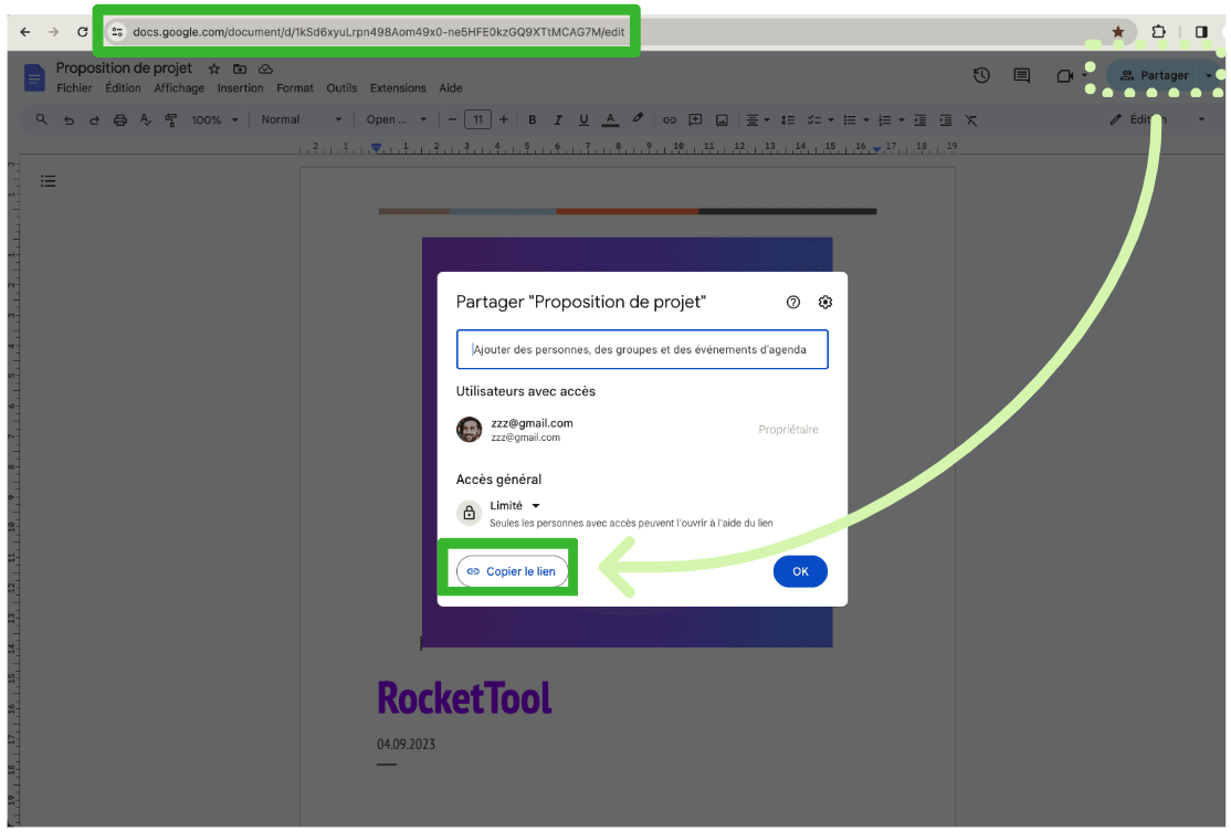 Illustration of how to access share URLs from a Google Docs document