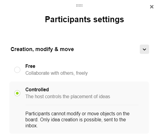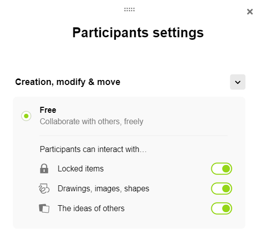 By default the Free mode is activated, participants are free and can interact with locked elements, drawings, images, shapes or ideas of others.