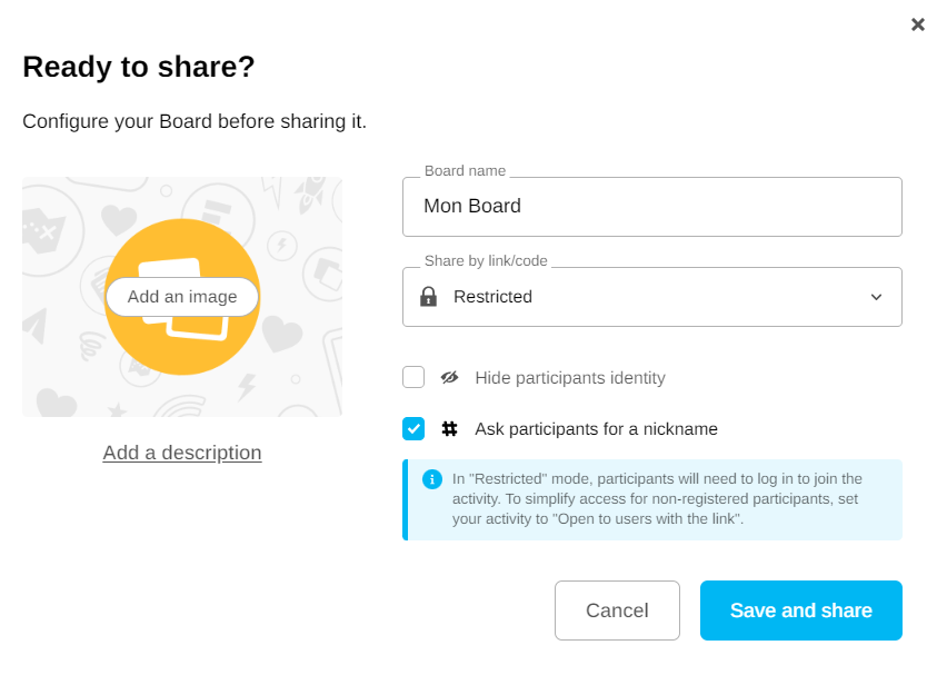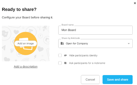 First, you can name the Board and define the level of access to the activity.The default sharing mode is “open for your team”: all members of your team or organization will be able to access the activity directly via a link or code, ensuring smooth collaboration from launch.