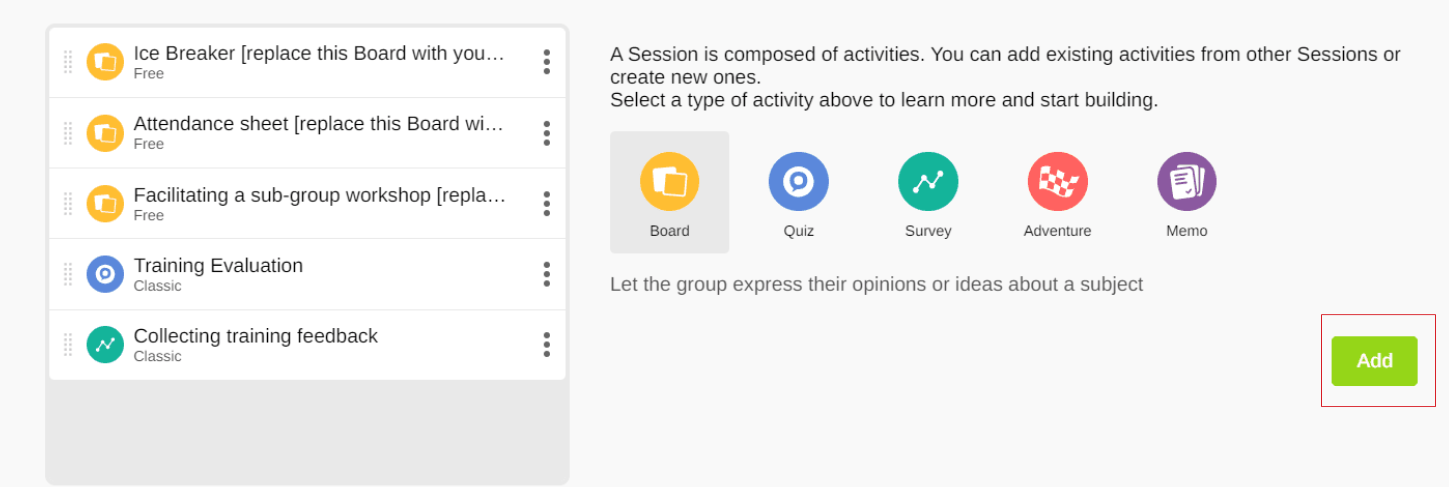 To add an activity to your Session, click on ‘Add’. Then select the activity or activities of your choice. They will then appear in the Activities section.