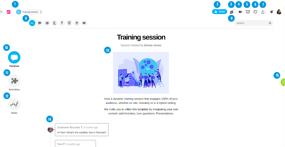 Main Session screen on which all messages sent by participants are displayed in chronological order along with all Activities and Live Questions and all presentation slides shared by the facilitator during the session.