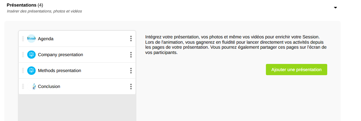 Optimise your Klaxoon sessions by integrating several presentations to enhance the content and liven up your presentations. This flexibility allows you to juggle different visual aids and structure your session according to your needs.