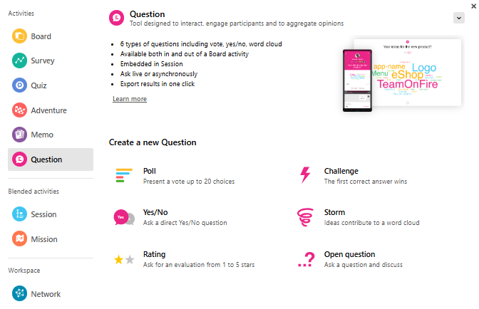 The Question feature is great for starting a debate, collecting short ideas, or getting immediate feedback from attendees during your meetings and workshops. With Question, you can solicit feedback from your team in seconds.