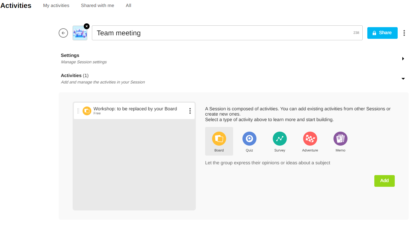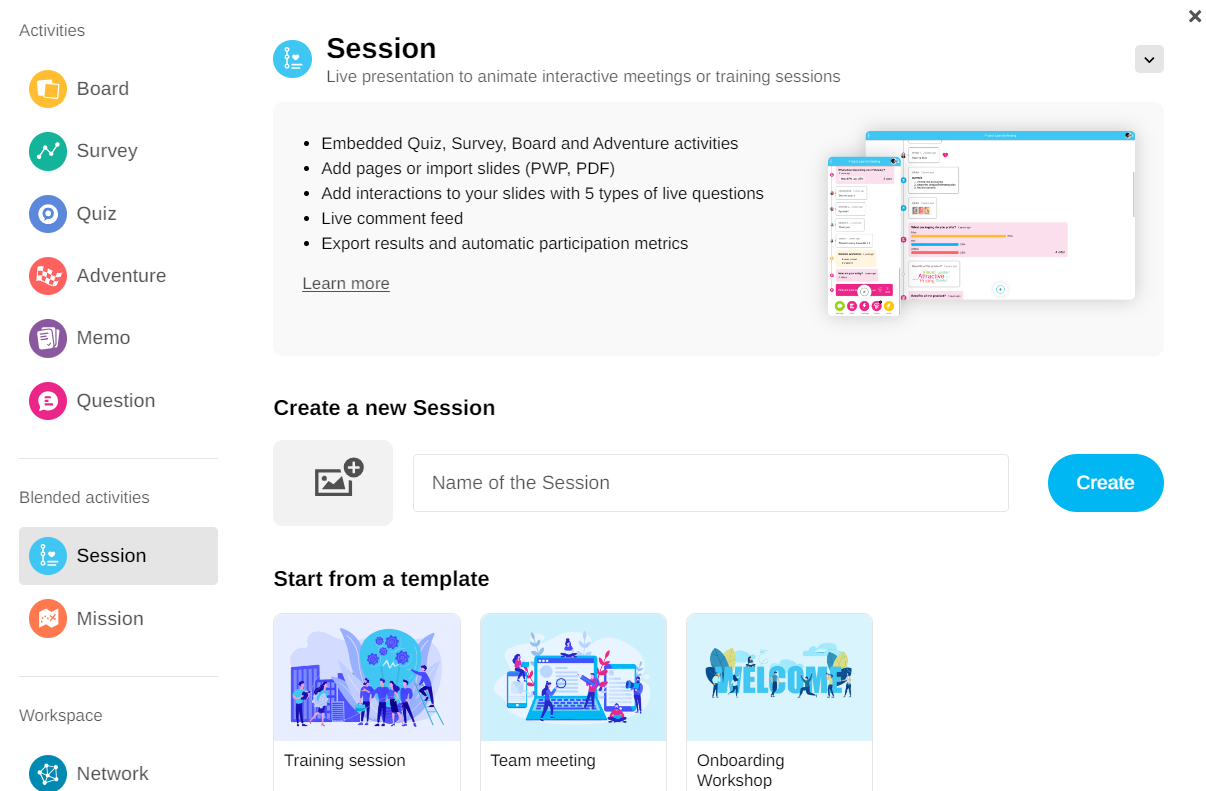 Sessions can include various activities such as Adventures, Boards, Memos, Quizzes or Surveys.