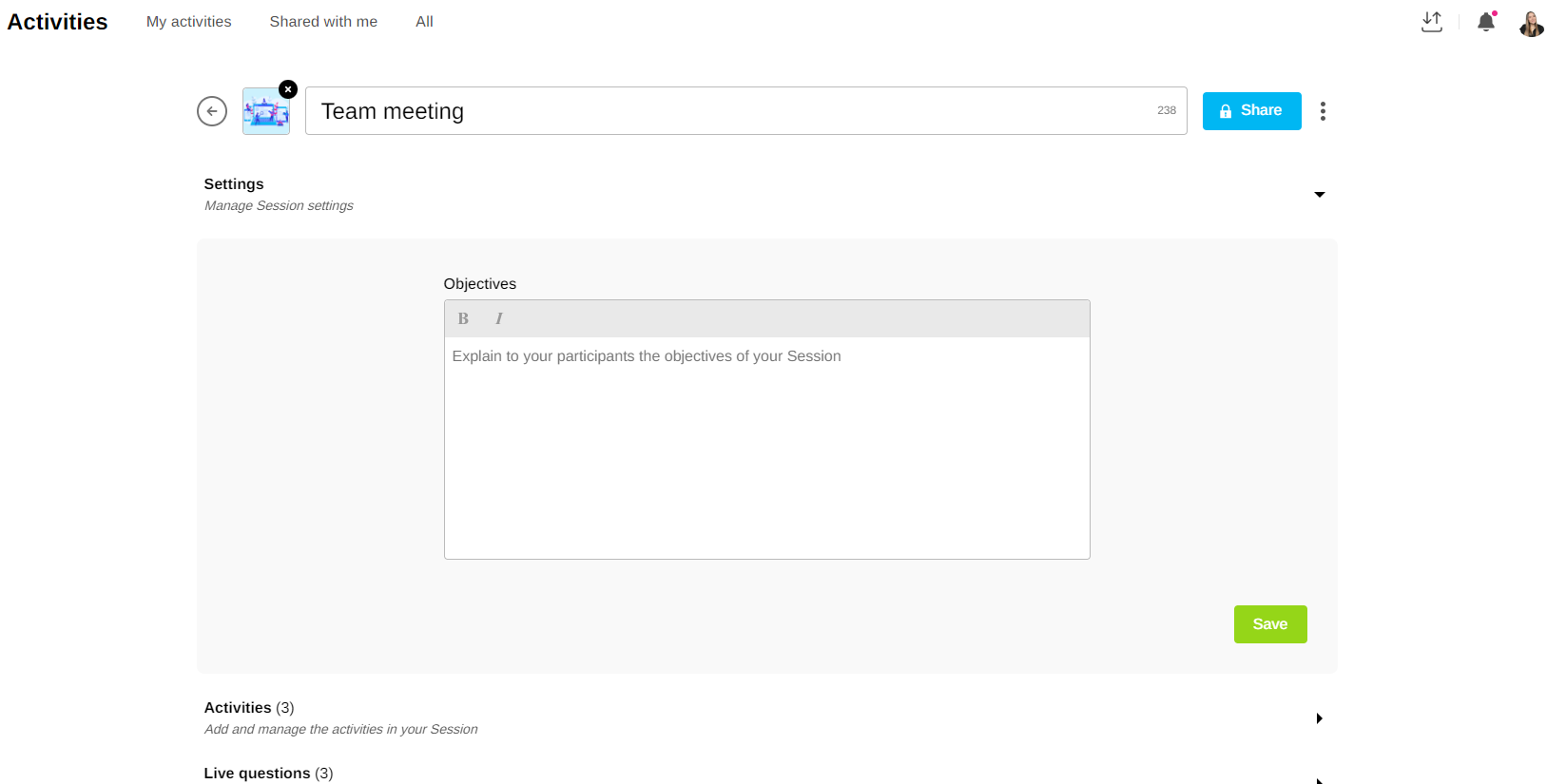 In the Settings section, write a blurb to inform participants about the objectives and content of the Session. Don't forget to click "Save" to save.
