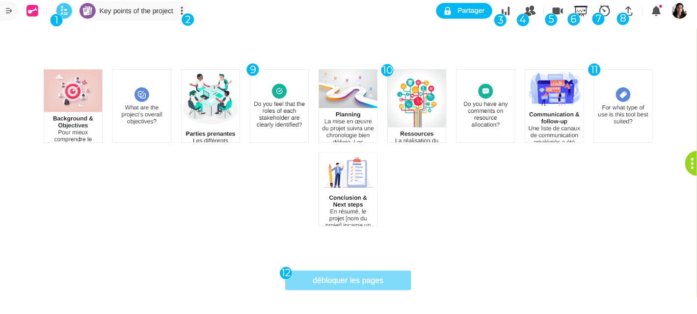 The dashboard a Memo launched in a Session provides a live view of the participants' progress, and the pages and the results of the questions completed by all the participants.